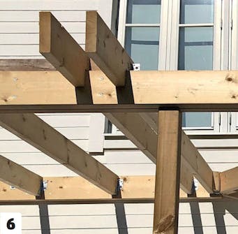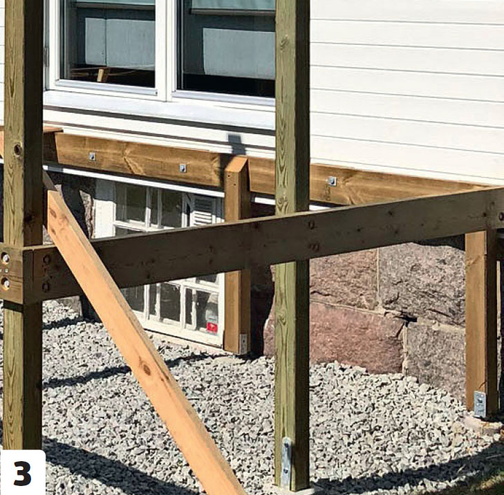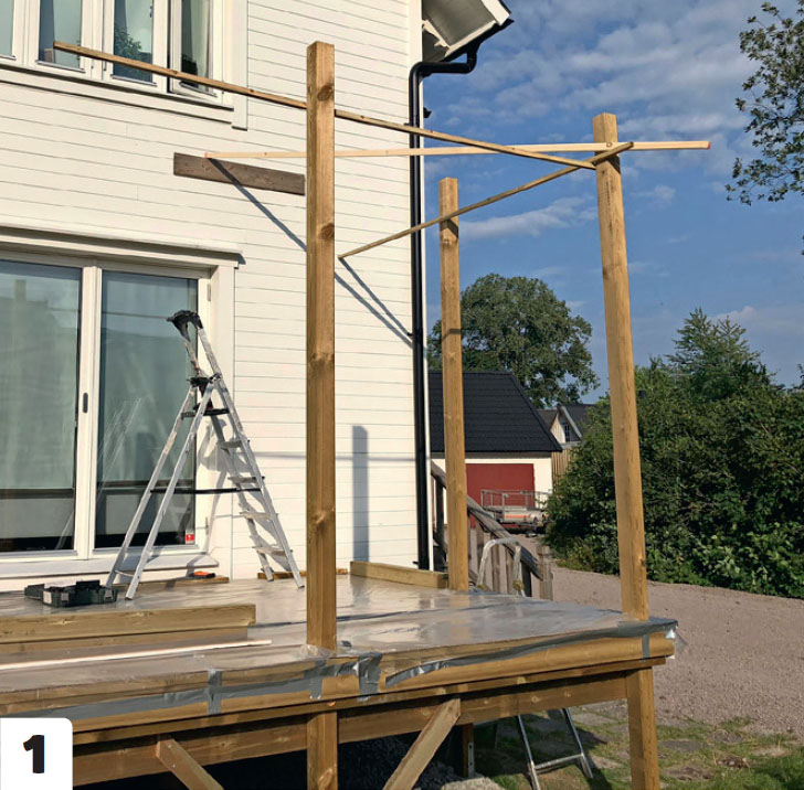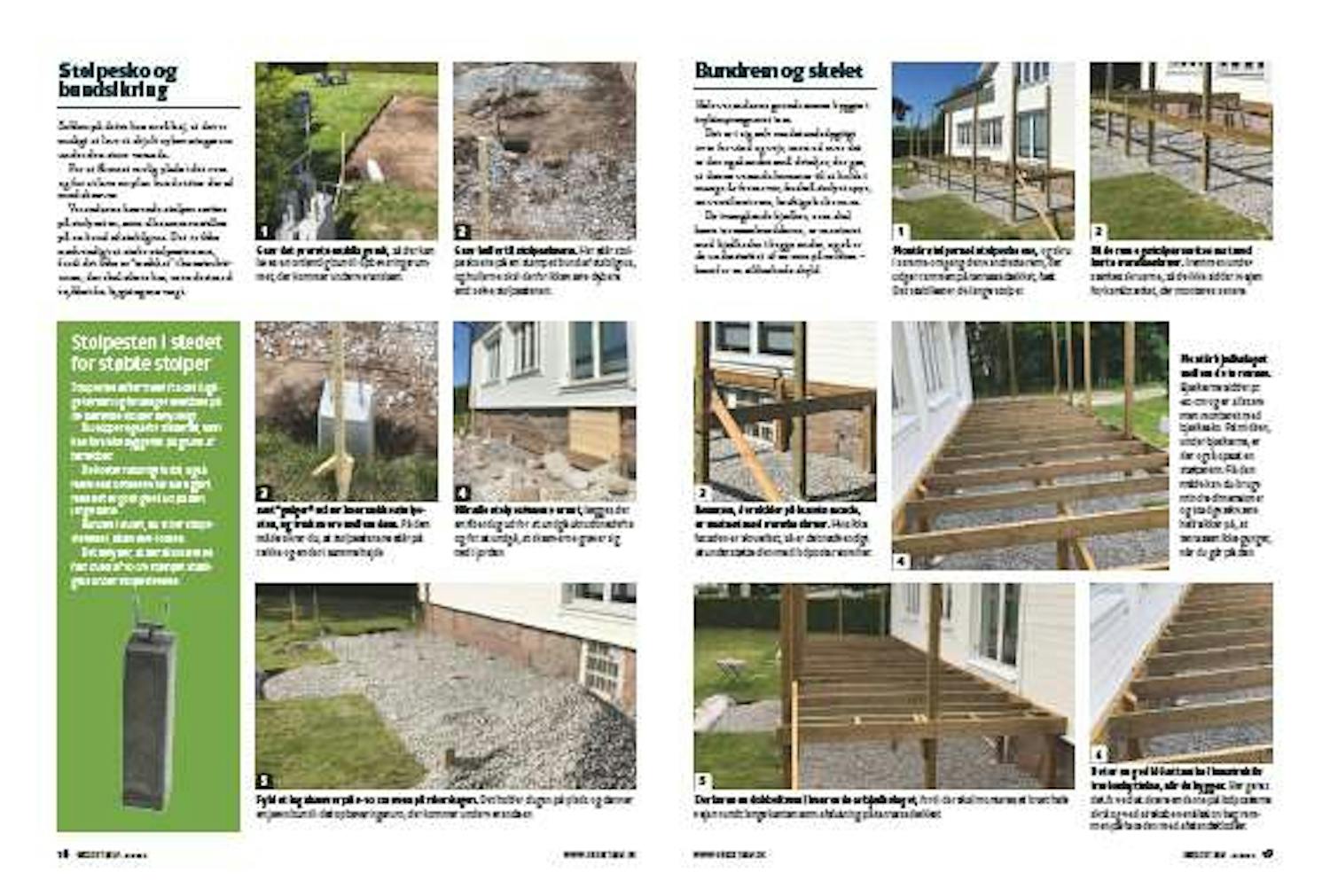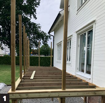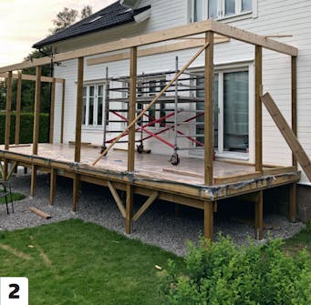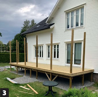 Montér stolperne i stolpeskoene, og skru i samme omgang den vandrette rem, der udgør rammen på terrassedækket, fast. Det stabiliserer de lange stolper.