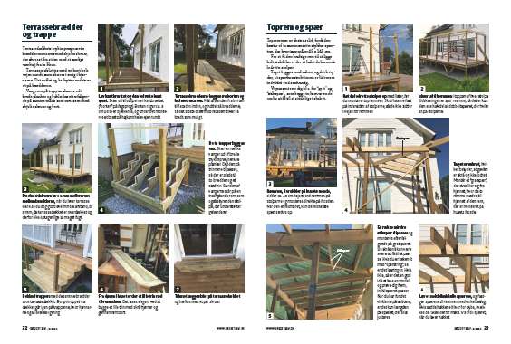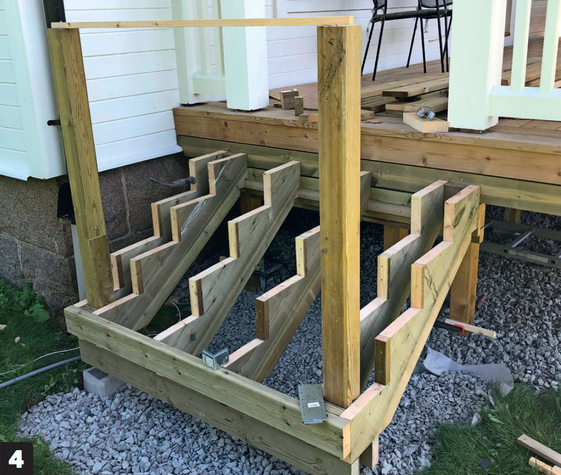 De to trapper bygges ens. Skær en række vanger ud af brede trykimprægnerede planker. Dybden på trinnene tilpasses, så der er plads til to brædder og et stødtrin. Bunden af vangerne står på en tværgående rem, som også styrer den stolpe, der understøtter gelænderet.