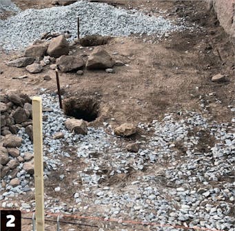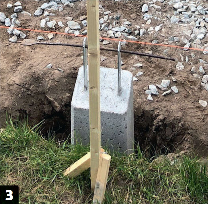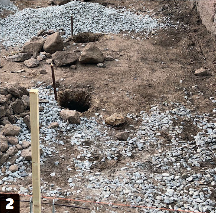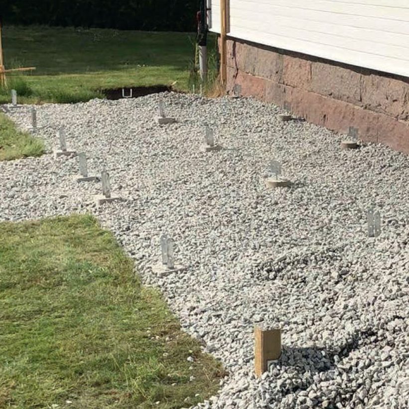 Grav huller til stolpeskoene. Her står stolpeskoene på en stampet bund af stabilgrus, og hullerne skal derfor ikke være dybere end selve stolpestenen.