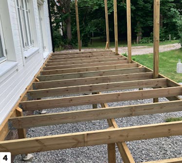 Montér bjælkelaget mellem de to remme. Bjælkerne sidder pr. 60 cm og er allesammen monteret med bjælkesko. På midten, under bjælkerne, er der også opsat en støtterem. På den måde kan du bruge mindre dimensioner og stadigvæk være helt sikker på, at terrassen ikke gynger, når du går på den.