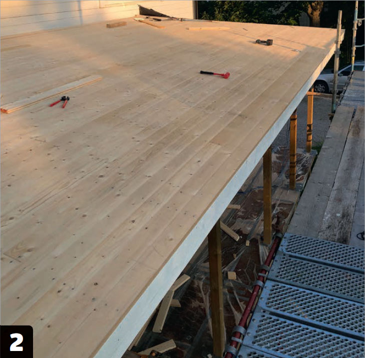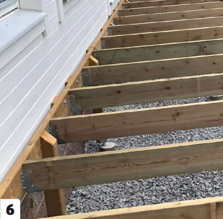 Der laves en dobbeltrem i hver ende af bjælkelaget, fordi der skal monteres et bræt hele vejen rundt langs kanten som afslutning på terrassedækket.