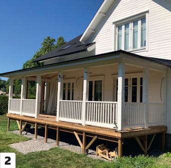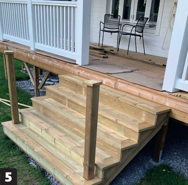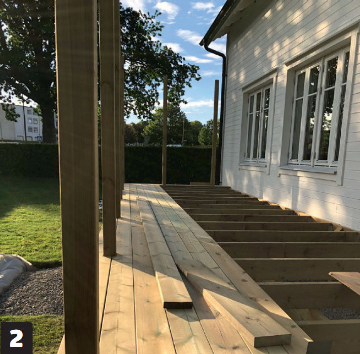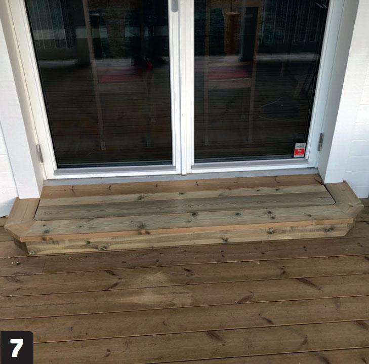 Fra døren i huset er der et lille trin ned til verandaen. Det løses elegant ved at bygge et lille trin med skrå hjørner og gennemført bort.
