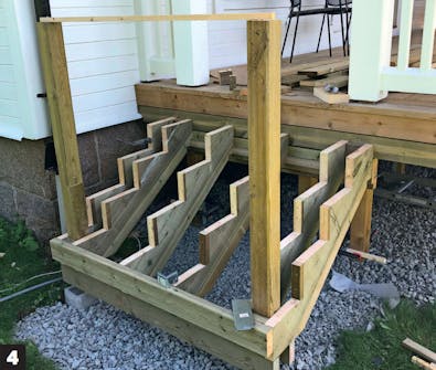 Beklæd trappen med de samme brædder som terrassedækket. Bortprincippet fra dækket går igen på trapperne, hvor hjørnerne også skæres i gering.