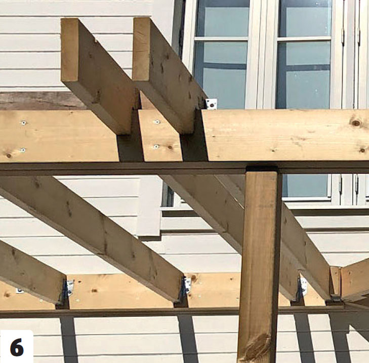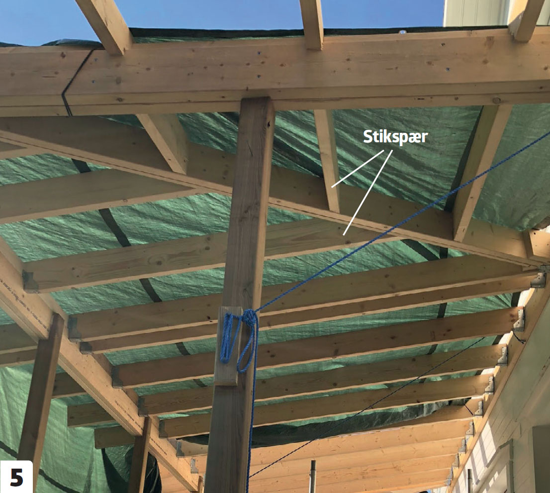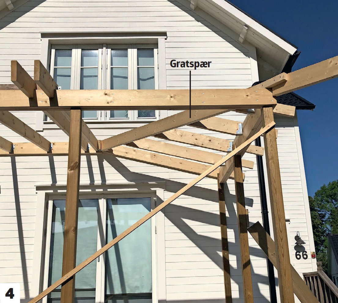 Remmen, der sidder på husets facade, sidder ca. 40 cm højere end rammen på stolperne og monteres direkte på facaden. Når den er monteret, kan de midterste spær sættes op.