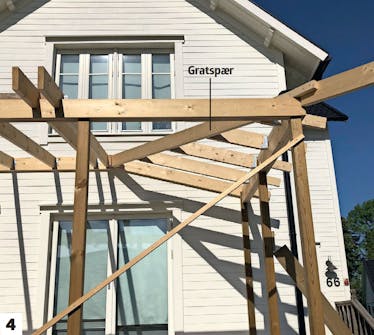 Taget er valmet, hvilket betyder, at gavlen er skrå og ikke lodret. Montér et “gratspær”, der strækker sig fra hjørnet, hvor de to remme mødes, til hjørnet af den rem, der er monteret på husets facade.