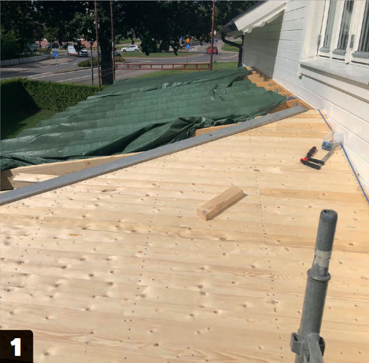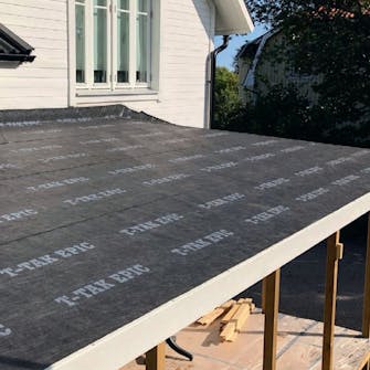 Efter underlaget kommer undertaget, og i dette tilfælde er det en speciel dug, der kan lægges direkte oven på brædderne, som der efterfølgende kan monteres et ståltag på.