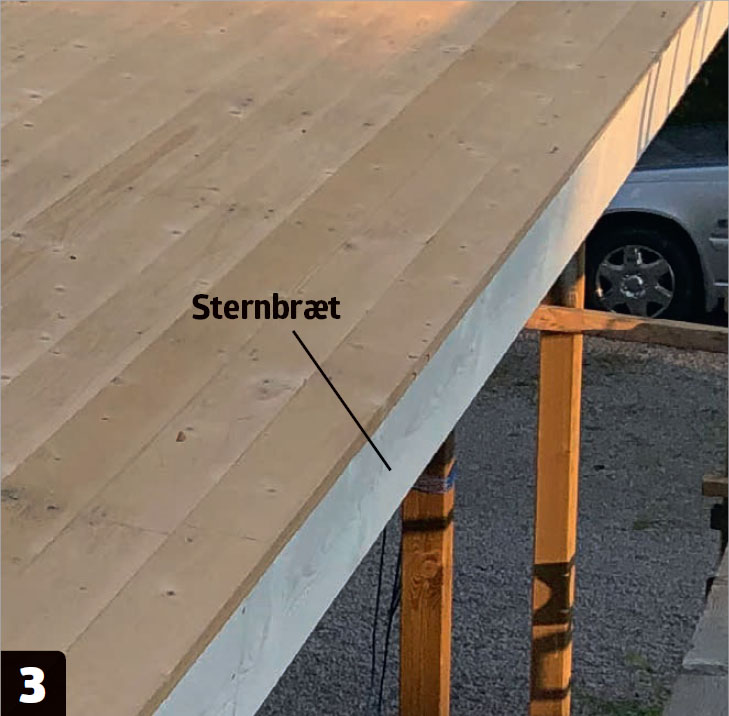 Det nederste bræt føres ud over det hvide sternbræt, så de to dele flugter. Sternbrættet monteres på spærenderne, inden tagbrædderne lægges.