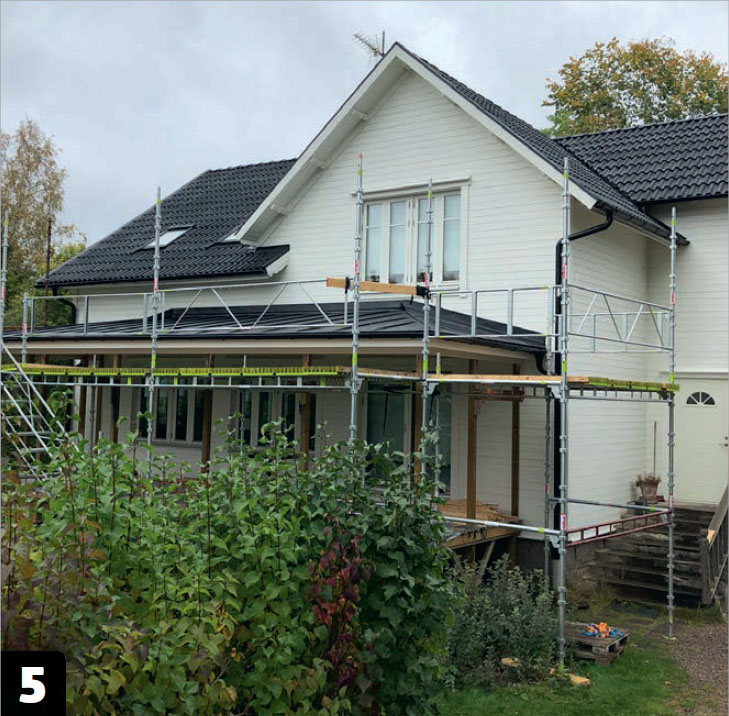 Det ømme punkt her er overgangen mellem facaden og taget på verandaen. Skær derfor en rille i beklædningen, og montér en løskant, som rager ud over undertaget. Løskanten er et profil, der er lavet af aluminium, som tætnes med silikone oppefra efterfølgende.
