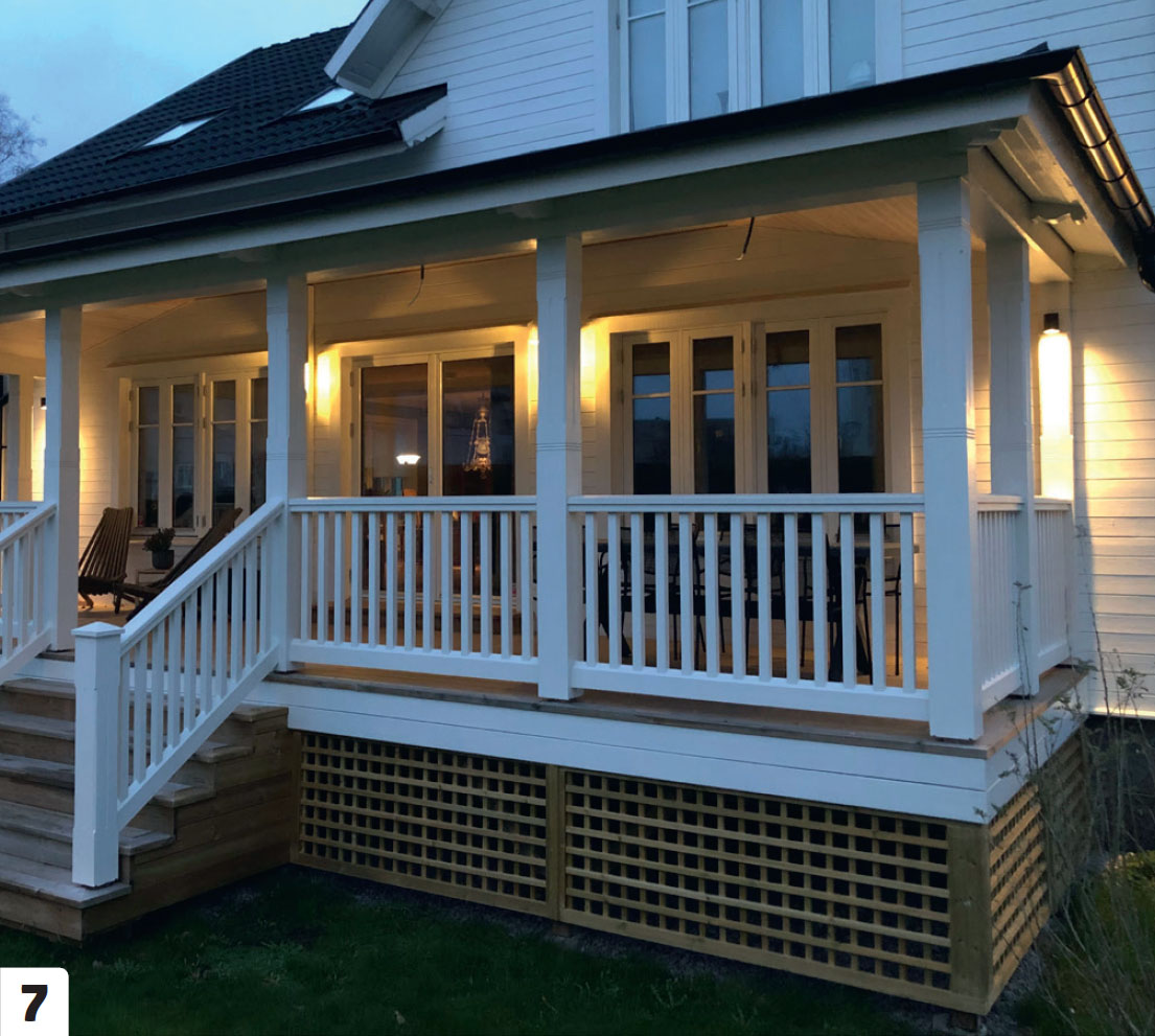 Gelænderet bygges også fra bunden, og det hele afsluttes med et utrolig flot flettet hegn, der lukker verandaen af i bunden. Det hele slibes, grundes og males med hvid højglans.