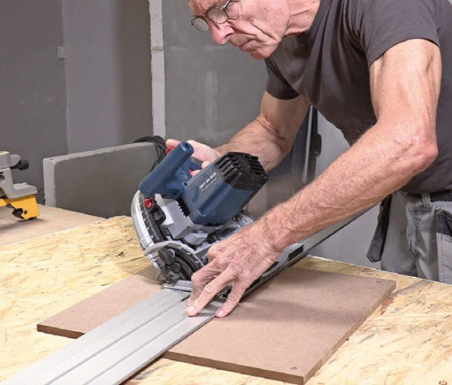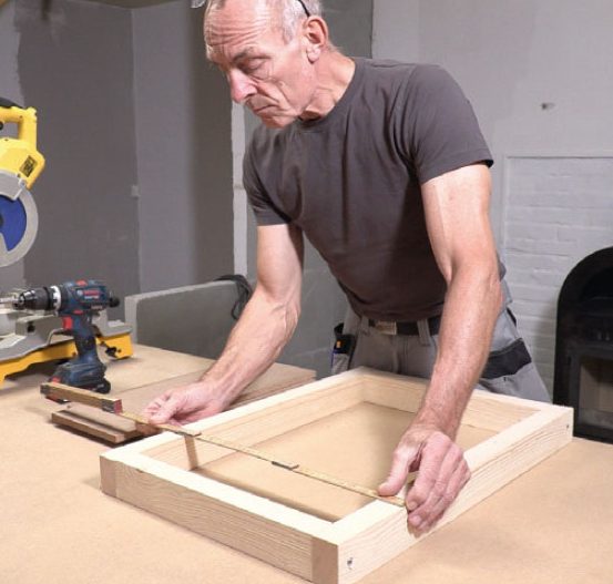 Skær en 18 mm MDF-plade til, så den passer bag på emnet, og lav herefter 45-graderssnit, så du får to lister, der passer sammen.