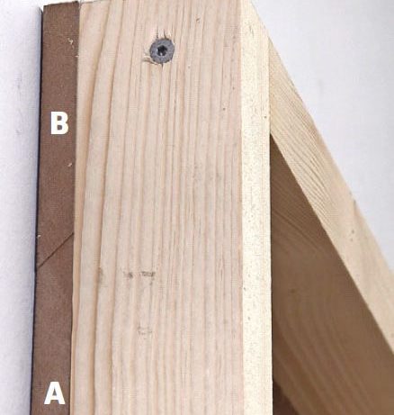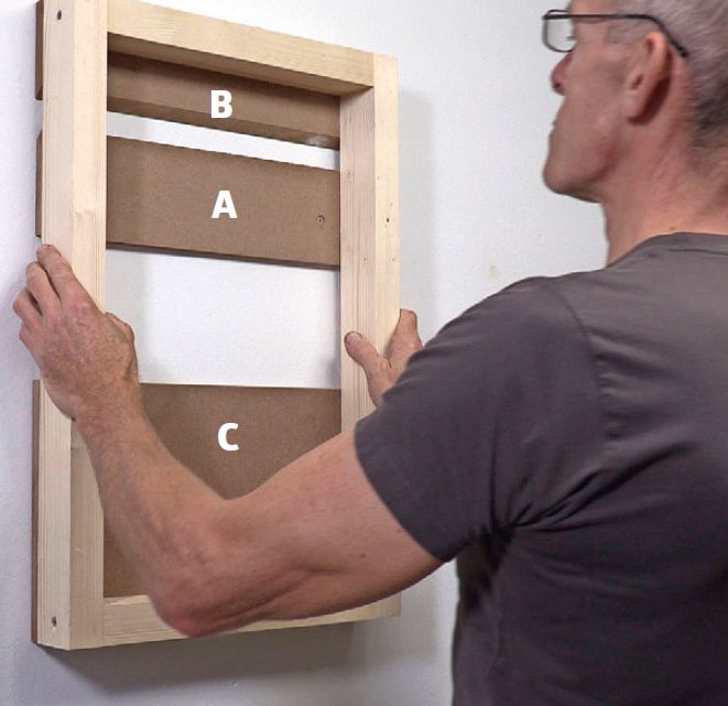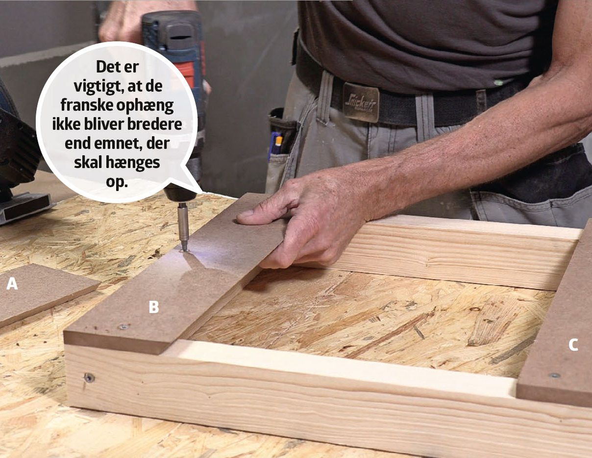 Skru den ene af de smigskårne lister (B) fast i emnet, og sørg for at vende den rigtigt, så den kan hægtes uden på den anden liste (A), som skrues fast i væggen. Ved at skrue en liste i samme tykkelse (C) fast i bunden af emnet får vi den samme afstand til væggen.