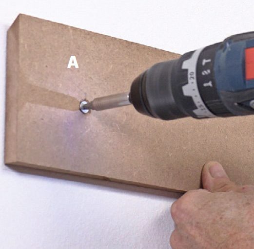 Skru den anden liste (A) fast i væggen, og sørg for, at den er helt i vater. Har du som os en gipsvæg, skal du huske at bruge gipsplugs.