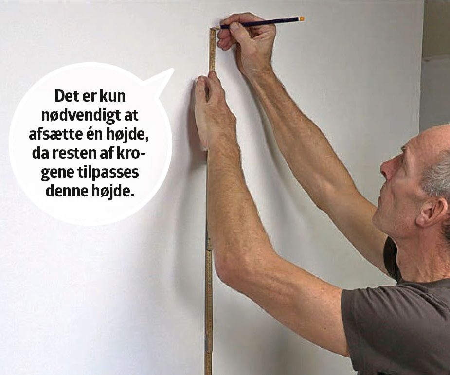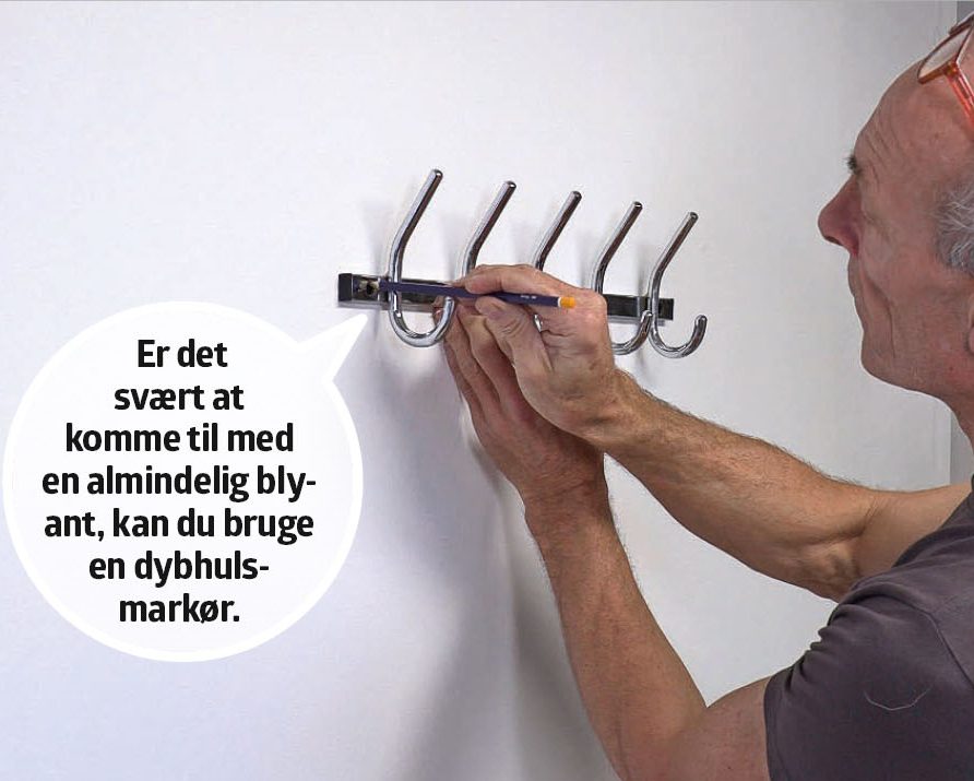 Skal du fx hænge en knagerække op, som kræver mere end en skrue, er fidusen at montere den ene skrue, bringe den i vater og markere, hvor det andet hul skal være. Herefter er det blot at bore et hul, montere en plug og skrue knagerækken fast.