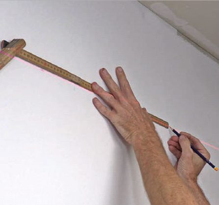 Hæng emnet op på væggen, så den ene liste (A) går i hak med den anden liste (B). Den tredje liste (C) sørger for, at bunden af emnet ikke søger ind mod væggen.