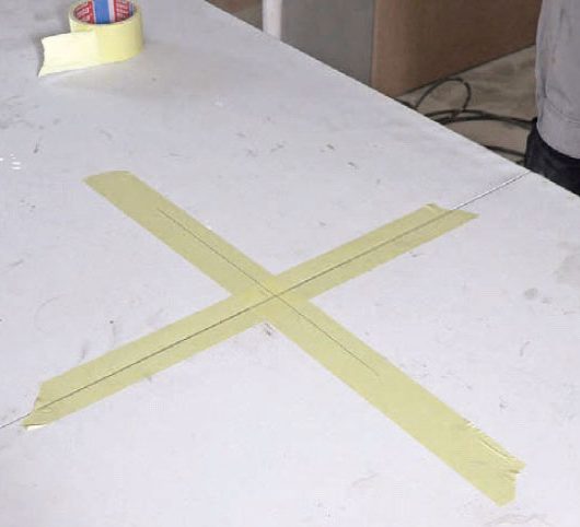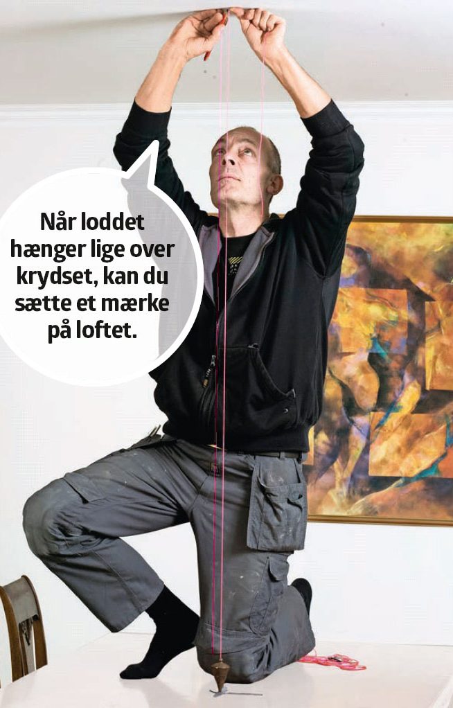 Gentag processen, men denne gang med bredden af bordet. Sæt en blyantstreg, så du får et kryds. Nu ved du, hvor bordets centrum er, og hvor centrum af lampen bør hænge.