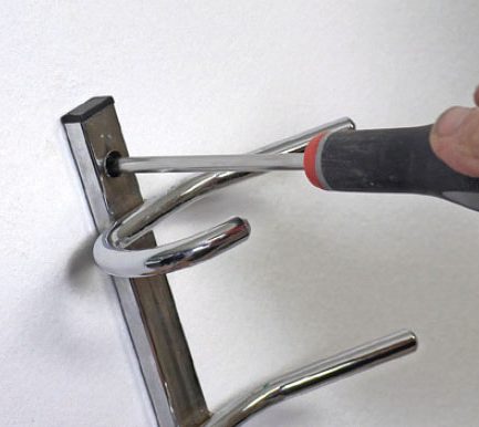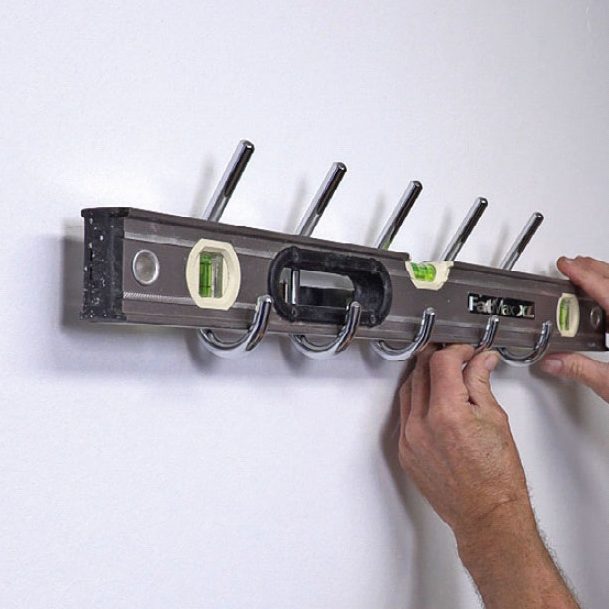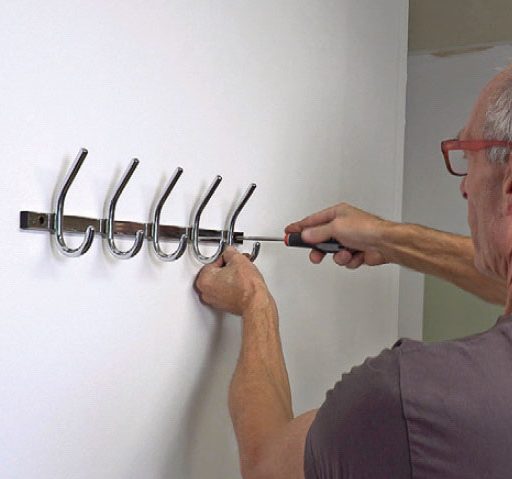 Skru krogene i ved håndkraft, og sørg for at holde dem vinkelret på væggen. Peger krogene i hver sin retning, er der nemlig ingen, der lægger mærke til, at de sidder på rad og række.