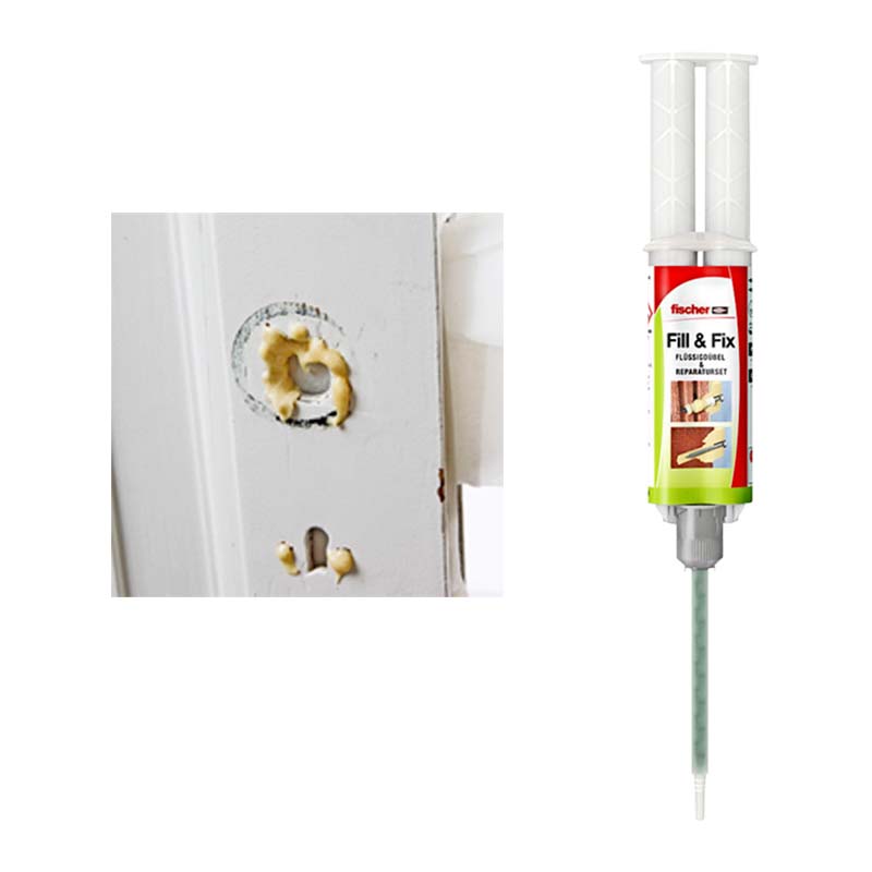 Er skruehullerne blevet for store, kan du ordne det med en tokomponent injektionsmasse, der tørrer lynhurtigt, fx Fill & Fix fra Fischer.