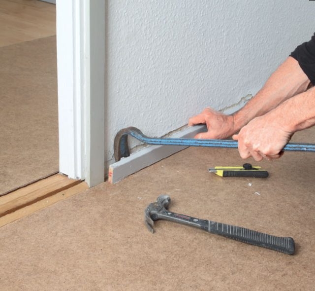 Fodpanelerne fjernes let med et koben. Skal du genbruge panelerne, kan du med fordel skære i overgangen ind mod væggen med hobbykniven. Så er panelerne lettere at få af i et stykke.