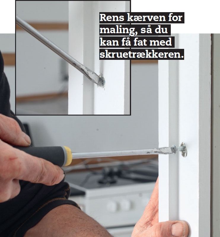 Skru karmen løs. Er karmen skruet i, kan du som regel skrue skruerne ud igen. Gammeldags skruer med ligekærv tages lettest med en håndskruetrækker. Til kryds- og torxkærv er skruemaskinen o.k.