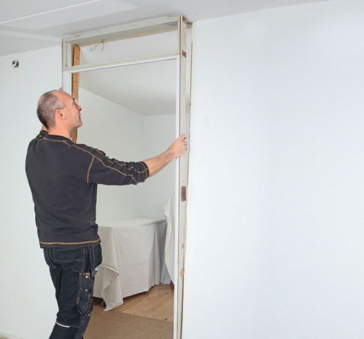 Bevar indfatningerne hele, hvis du vil genbruge dør og karm et andet sted i huset. Her er det plastindfatninger, som forsigtigt hives af.