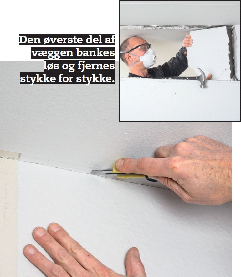 På den ene side af døren skal væggen fjernes helt. Start oppefra med et vandret snit under loftet, og bank det første stykke væg løs. Herefter kan du komme til med bajonetsaven og skære væggen ned i passende stykker.