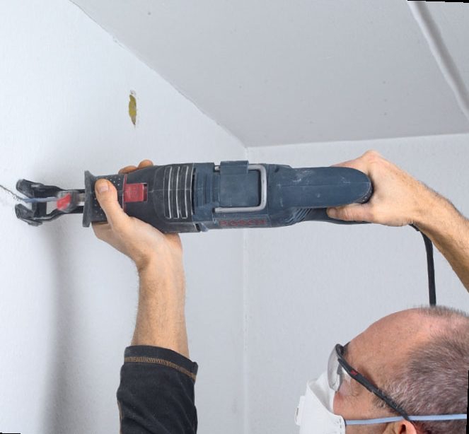 Start med et vandret snit, 20-30 cm under loftet. Vælg en passende klinge, og lad bajonetsaven gøre hele arbejdet.