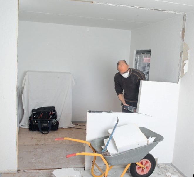 Nu er det bare at gå i gang med det grove værktøj. Tjek lige, om du har husket at lukke dørene til resten af huset og har dækket møbler, lamper og andet, som ikke skal dækkes af støv, ordentligt af.