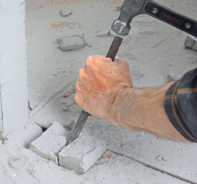 Fjern de sidste stumper med hammer og mejsel. Specielt den nederste del af væggen, som går gennem gulvet, kan være svær at få op. Del i mindre stykker, og lirk stumperne op.