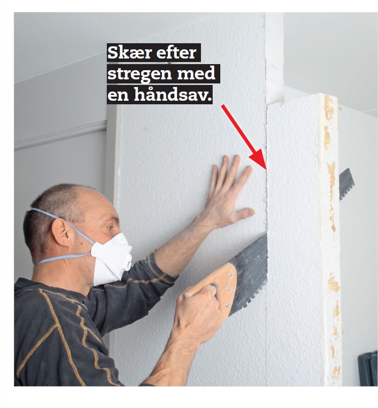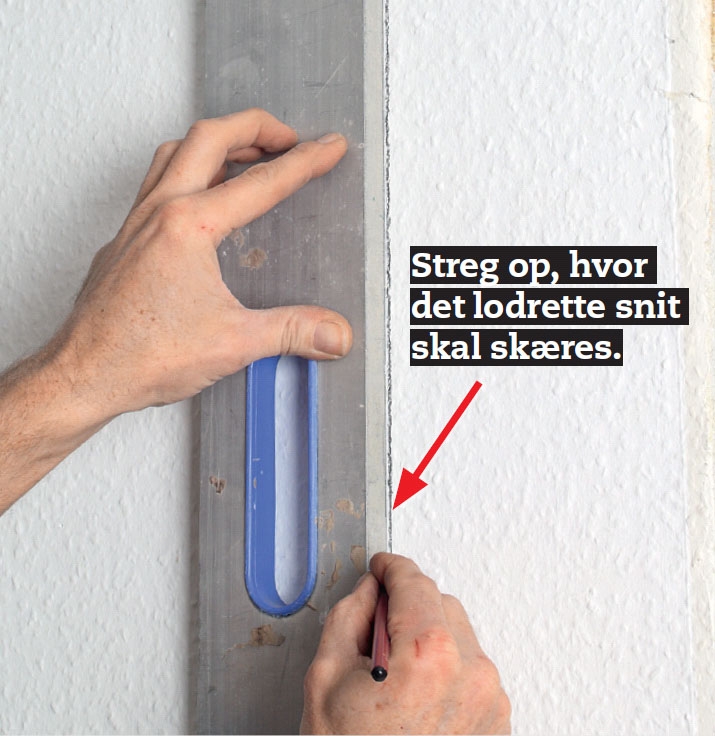 Mål op, og slå en lodret streg fra loft til gulv der, hvor væggen skal gå til. Så har du noget at skære efter.