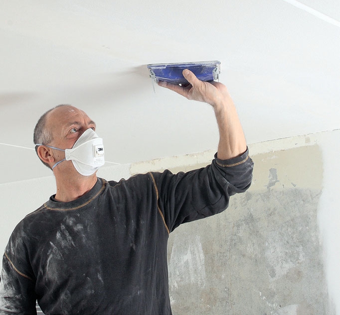 Slib også loftet, hvor du har spartlet. Her vil vi anbefale, at du bruger beskyttelsesbriller sammen med støvmasken. Slib, før du tapetserer, da det sviner temmelig meget.