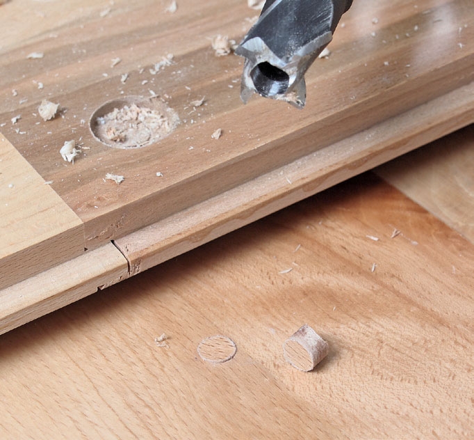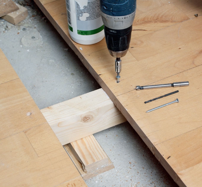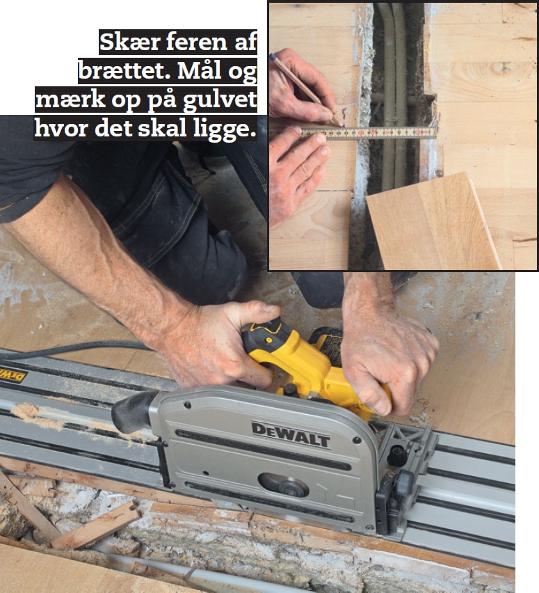 Læg brættet ned på plads. Her er det i flere stykker, så samlingen skal ligge tæt på en understøtning, og fer og not skal limes, før du skruer brættet fast.