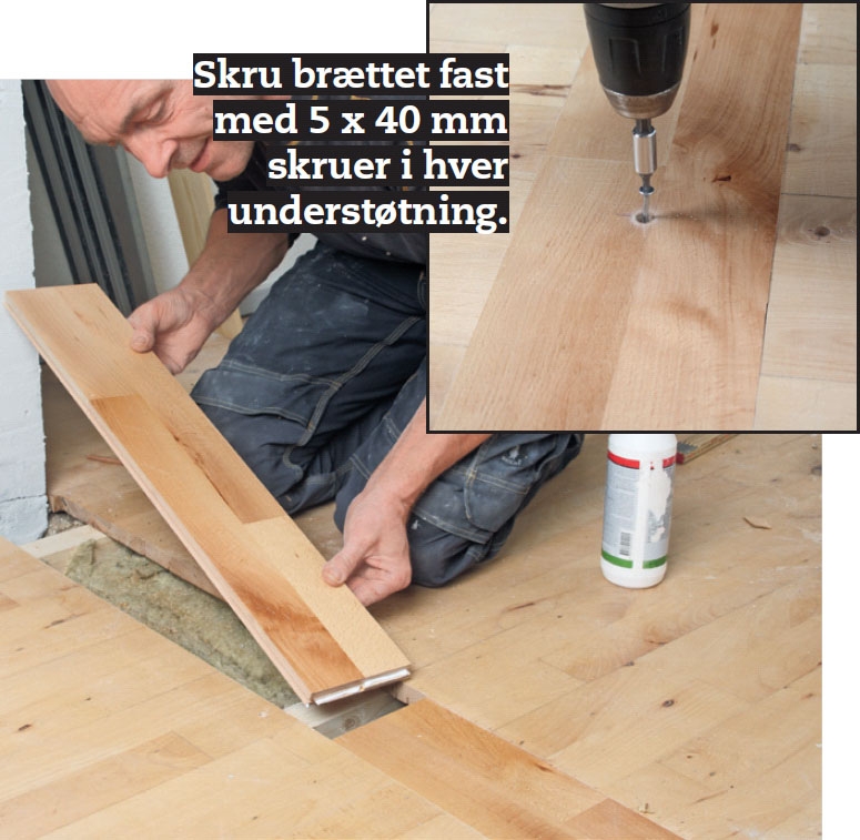 Du skal understøtte reparationer i gulvet for hver 30-40 cm, så gulvbrættet ikke knirker og giver efter, når du træder på samlingen.