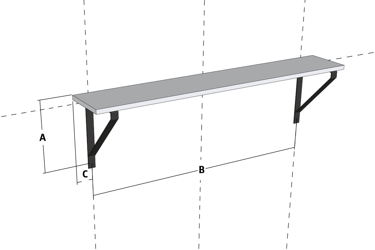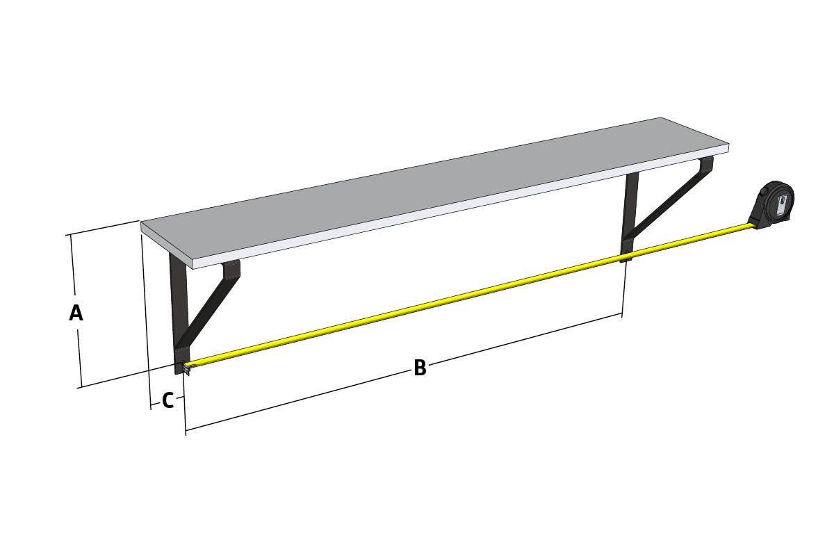 Mål en eventuel afstand mellem hyldens kant og skruens placering (C).