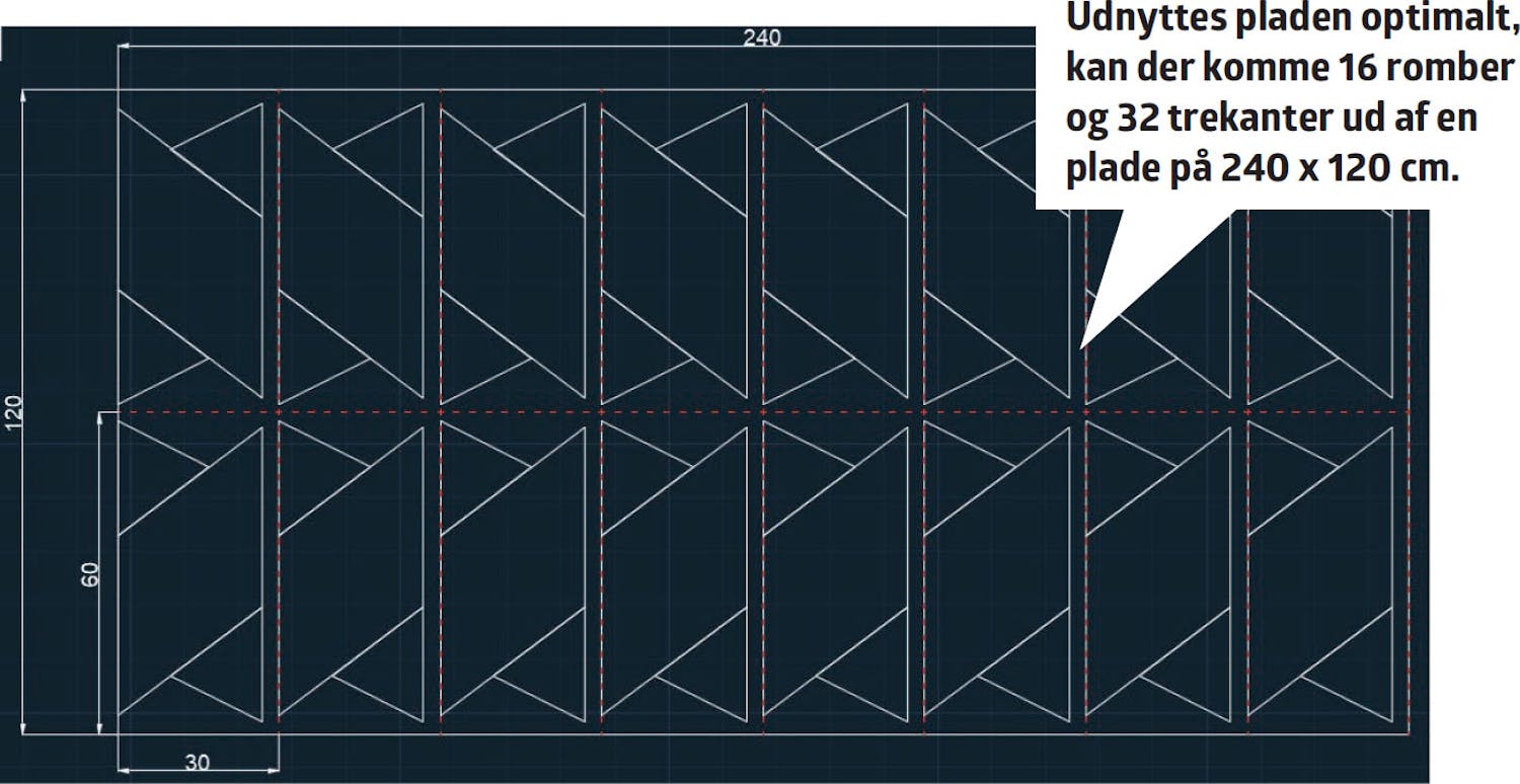 Montér en fast skabelon (A) på bordrundsaven, der passer med skæreskabelonen, så romberne skæres ens hver gang. Alternativt kan en dyksav med skinne også sagtens bruges.
