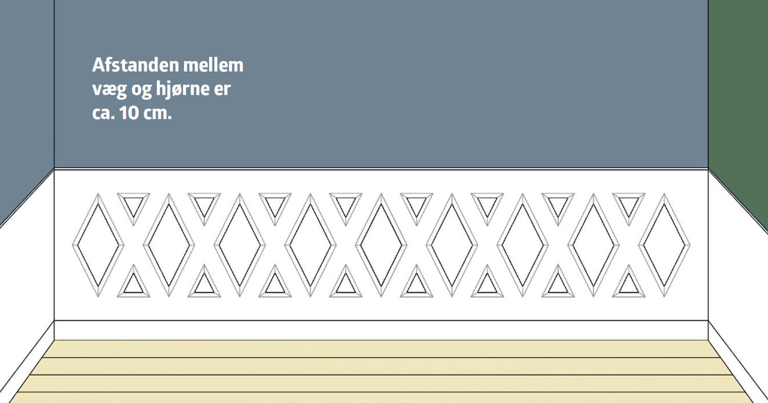 I luftspalten omkring romber og trekanter monteres en kvartstafliste på 13 x 13 mm. Den gør det nemmere at male og giver et mindre kantet udtryk.