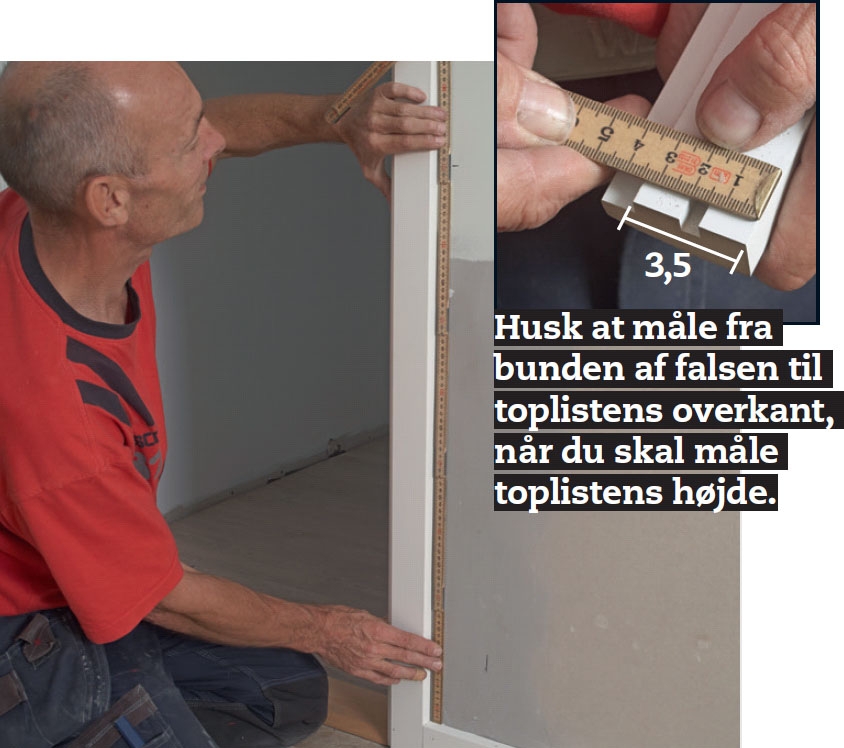 Mål op, så du kan skære vægpanelerne til. Højden på panelpladerne finder du ved at måle fra oversiden af fodpanelet til din færdig-markering og trække toplistens højde fra.