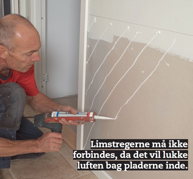 Kom monteringslim på væggen med ca. 10 cm’s mellemrum. Påfør limen på skrå, så du får lim under samlingerne. Kom lim på til en plade ad gangen, så den ikke når at tørre i overfladen.