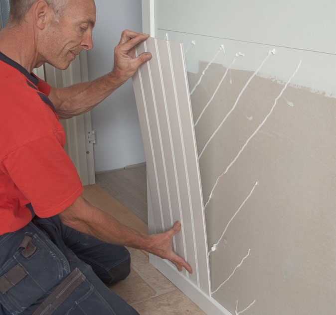 De høje paneler monteres på væggen med lim. Vi bruger en moderne vandbaseret monteringslim, der er meget effektiv. Er væggen plan, kan du nøjes med at trykke panelerne fast i limen. Er væggen skæv eller har buler, kan det være nødvendigt at holde pladerne på plads, indtil limen er tør i løbet af et par timer.