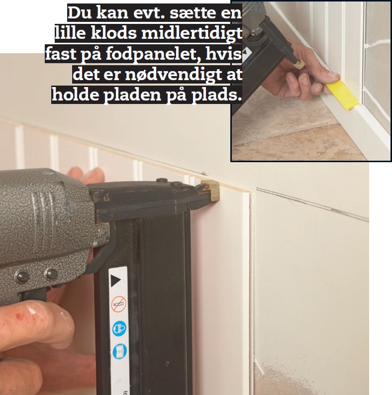 Du kan holde panelerne fast med en enkelt dykker helt oppe i toppen, så den bliver dækket af toplisten, og med en midlertidig klods på fodpanelet. Det blev vi nødt til at gøre her. Du kan evt. også bruge tape eller på anden måde fiksere pladerne og listen, der også limes fast.