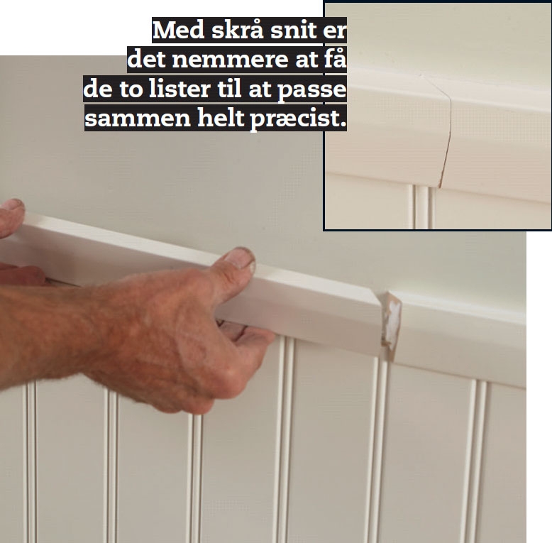 Toplisten samles med et skråt snit. Hvis toplisten er lang, skal den samles af flere stykker, og så er det en fordel at skære samlingen med et snit på 30-45 grader. Det skrå snit giver en større limflade, og samlingen bliver pænere og mere præcis.