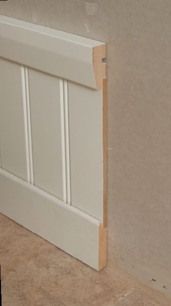Her bygges de høje paneler op helt fra bunden med nye fodpaneler, der sættes op først, så panelerne kan “stå” oven på dem. Du kan sagtens bruge de eksisterende fodpaneler, hvis du er tilfreds med dem. Vi har valgt nye fodpaneler, der er helt glatte, så det samlede indtryk bliver så enkelt som muligt.