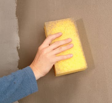 Den sidste glatning af multipudsen kan klares med et pudsebræt forsynet med svamp, men det er faktisk meget nemmere og mere sikkert for den uøvede blot at bruge en stor svamp. Så er risikoen for at lave spor i pudsen mindre.