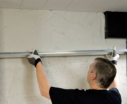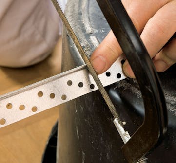 Hjørneskinner saves til i den rigtige længde. Brug en nedstryger. Hjørneskinnerne har to funktioner: De forstærker hjørnerne, men bruges også, når du skal trække gipspudsen af med bræt eller retskinne.