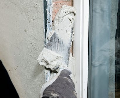 Vinduesfalsen fyldes med gipspuds. Brug en spandeske til at påføre pudsen, der presses godt ind i fugerne mellem murstenene.