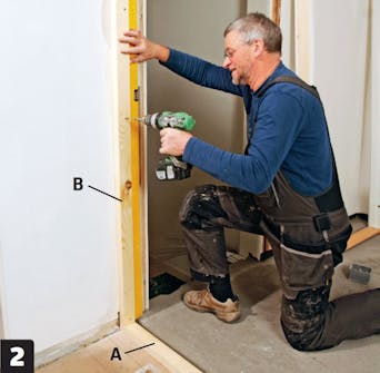 Beslut dig for, hvor dørkarmen skal placeres, og markér placeringen på gulvlægten (A) med en blyant på begge sider af karmen.