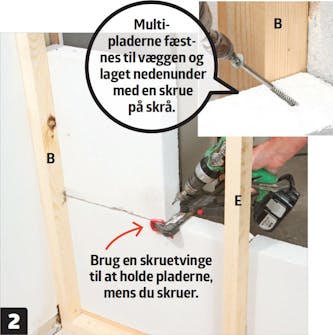 Gå om på den anden side af multipladerne, og skru dem fast til lægterne. Vi giver multipladerne to karmankre, 7,5 x 112 mm, i hver af lægterne (B og C) ind mod væggen og en enkelt skrue i de øvrige lægter.