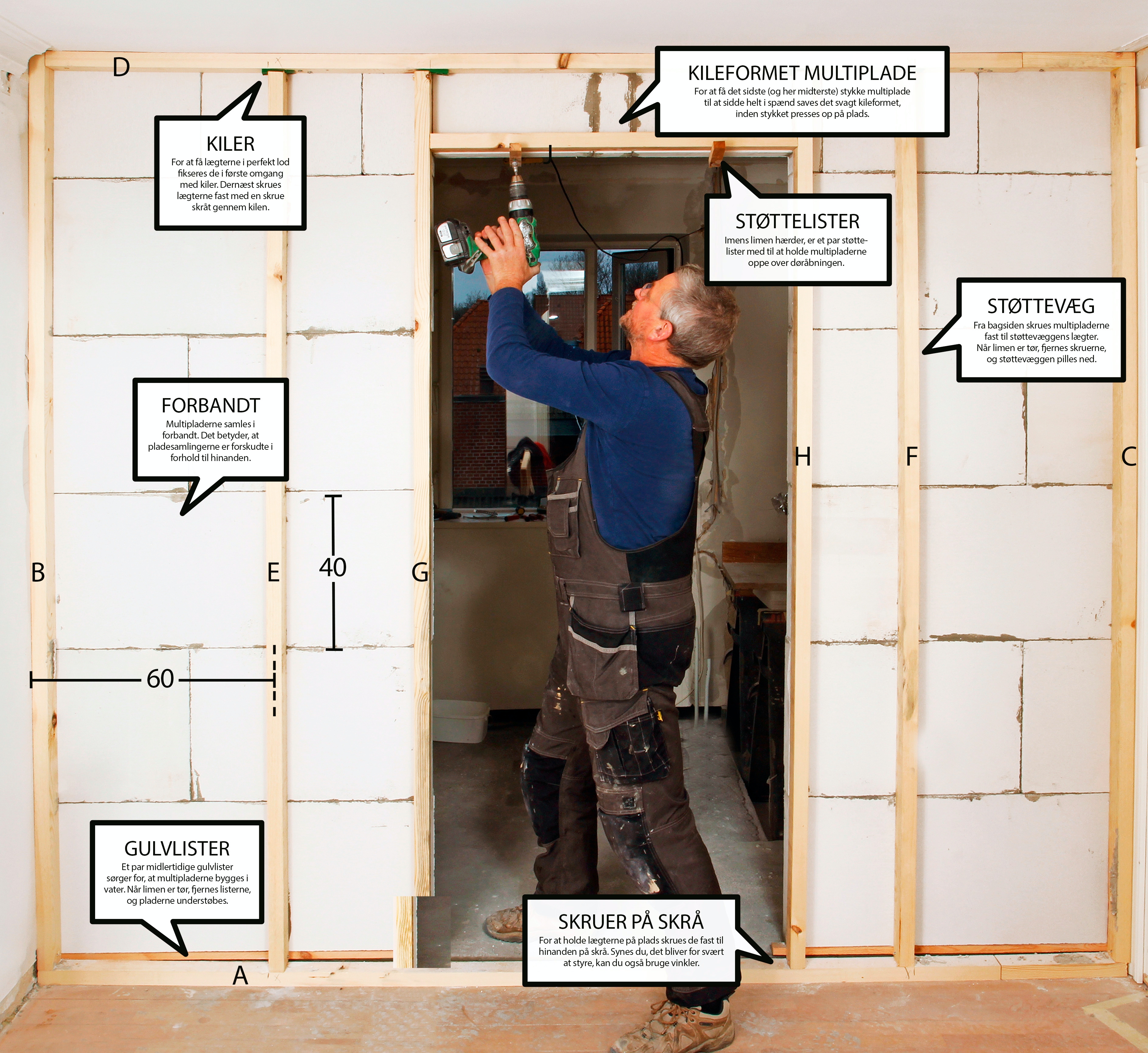 Gulvlægten (A) skrues fast til gulvet med 4 x 50 mm skruer. Dernæst stilles yderlægterne (B + C) oven på gulvlægten og skrues fast til væggen med 5 x 80 mm skruer. Lægterne (B + C) skal gå helt op til loftet.