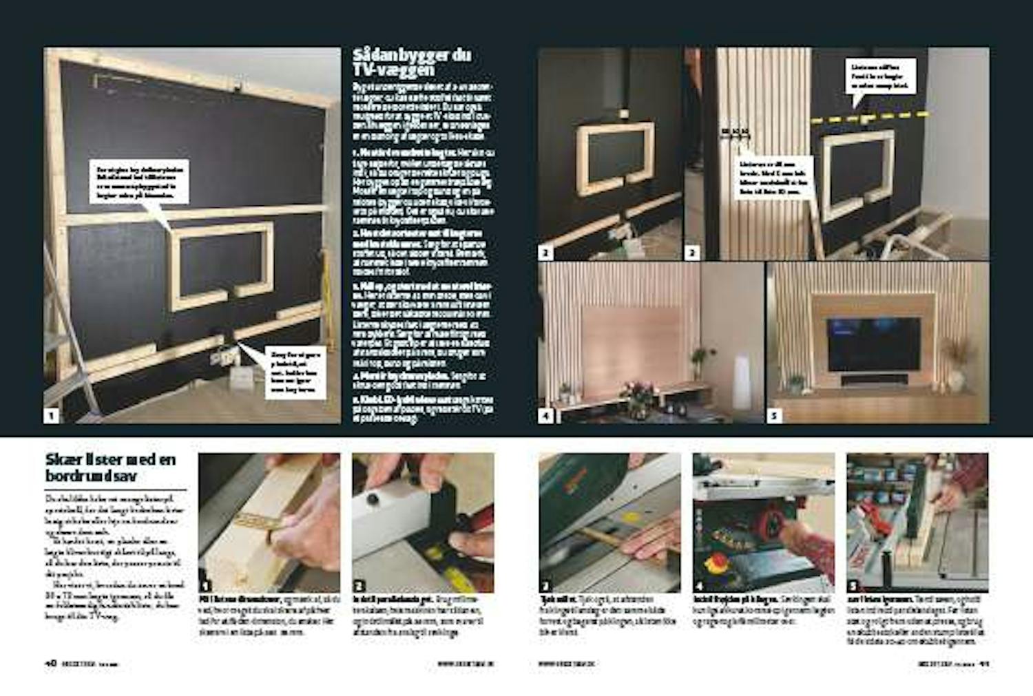 Byg et underliggende skelet af 3-4 vandrette lægter, du kan hæfte stoffet fast til samt montere de lodrette lister i. Du har også mulighed for at bygge et TV-skab ind i bunden af væggen ligesom her, hvor løsningen er en blanding af lægter og to Ikea-skabe.