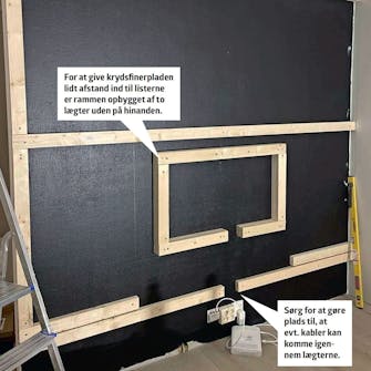 Montér de vandrette lægter. Her skal du tage højde for, hvilket underlag de skrues ind i, så du bruger de rette skruer og plugs. Her bygges op ad en gammel træpladevæg. Montér en lægte i top og bund og en på midten (bygger du uden skab, ville vi fordele to på midten). Det er også nu, du skal lave rammen til krydsfinerpladen.