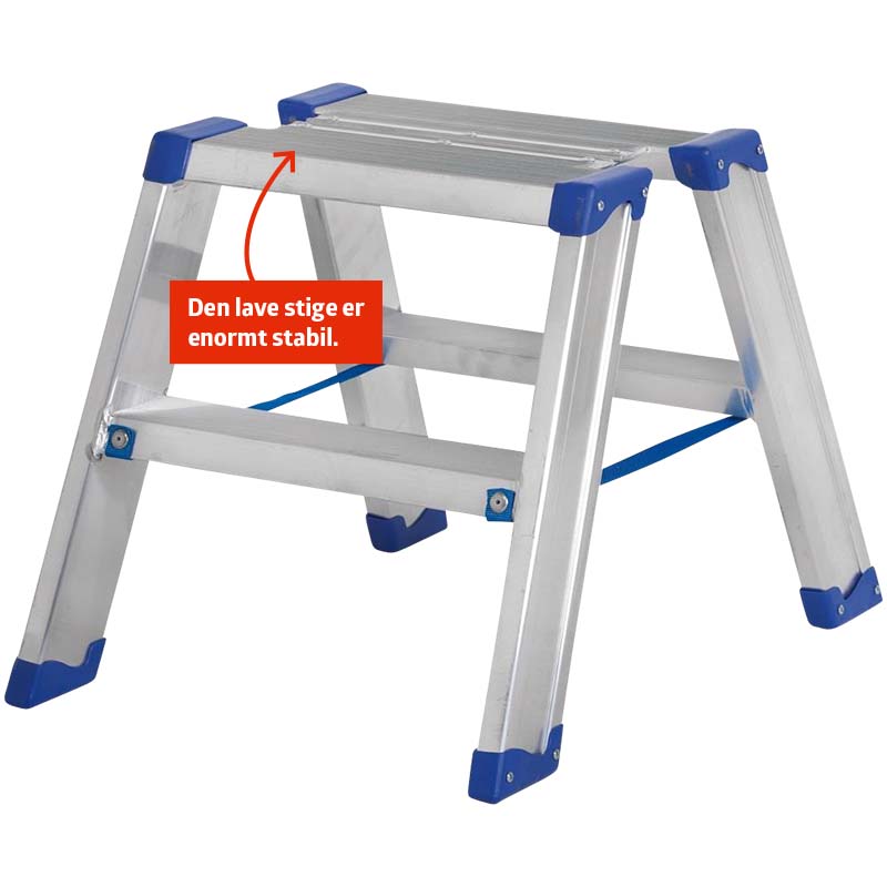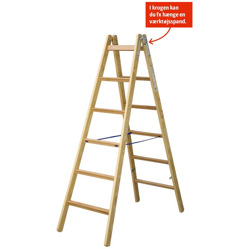 er mange håndværkeres foretrukne stige. Den bruges fritstående, og placerer du dig med et ben på hver side af stigen, står du enormt stabilt. Hængslerne er udstyret med kroge, hvor du fx kan have en maler- eller værktøjsspand hængende.